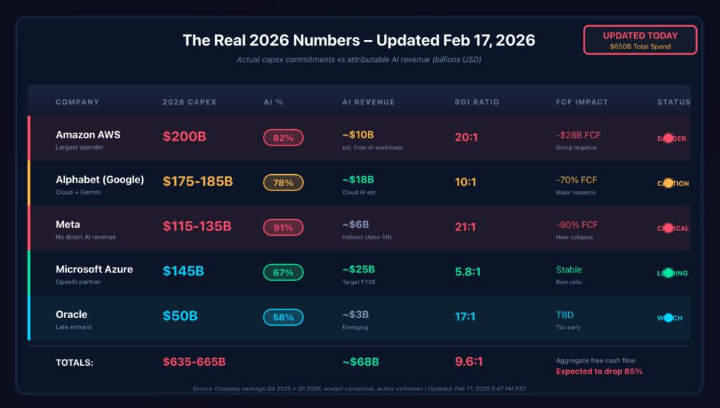 Amazon’s at $146 billion projected for 2026. Oracle, the smallest of the five, is still throwing $25 billion at it.