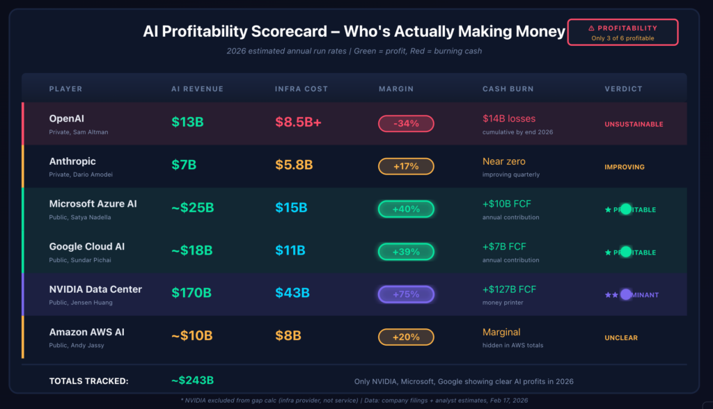 NVIDIA’s the outlier. $170 billion in data center revenue. Costs are $42 billion. That’s a 75% gross margin. Generating $128 billion in free cashflow. They’re winning while everyone else figures out how to make the models pay.