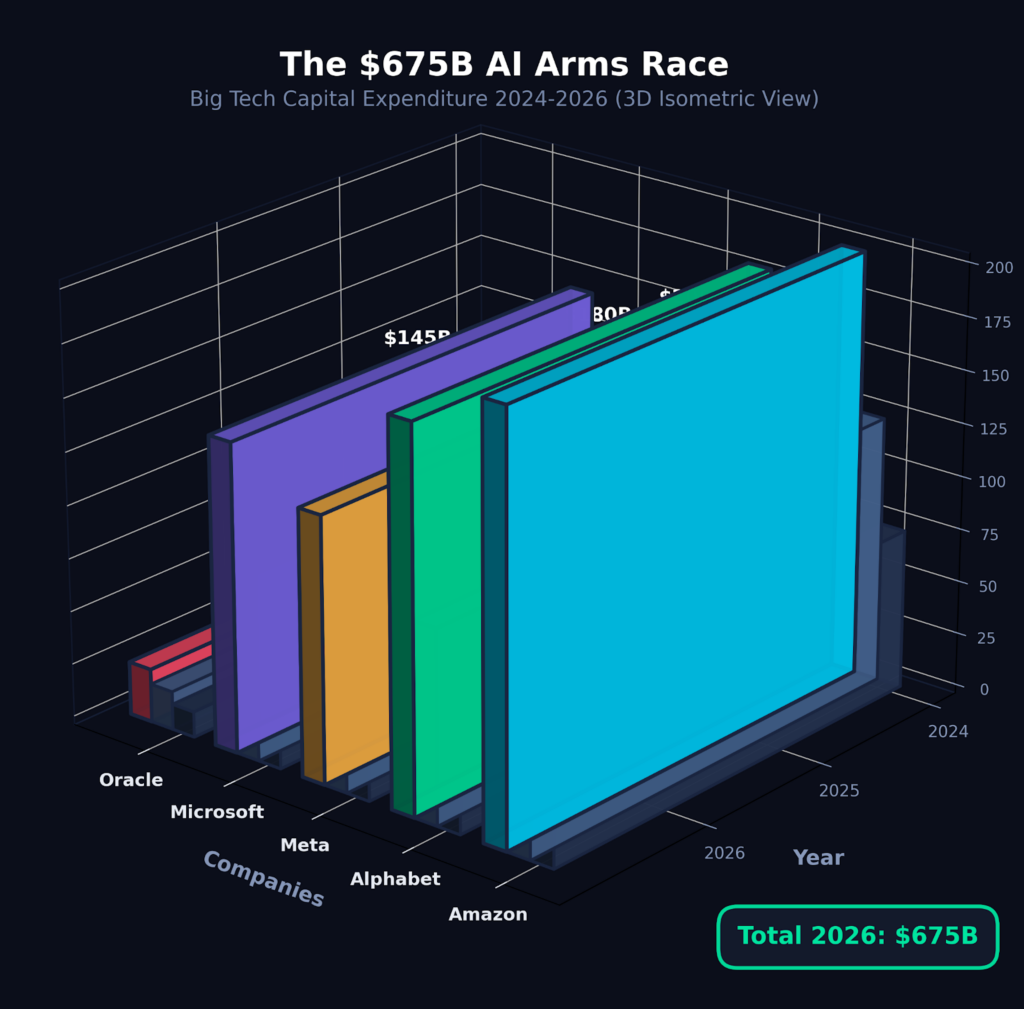Add it up: these five companies alone are spending somewhere between $560 billion and $590 billion in 2026. About 75% of that is pure AI–chips, data centers, networking gear, power infrastructure.