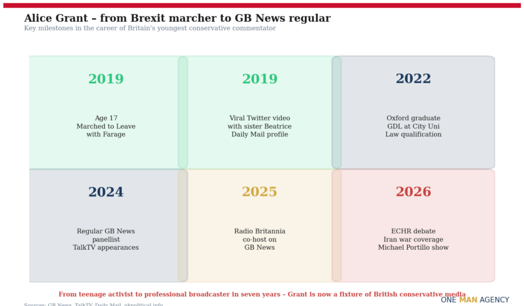 In 2026 Grant is 24, an Oxford graduate with a Graduate Diploma in Law from City University, a regular panellist on GB News, co-host of Radio Britannia and a fixture on the Michael Portillo Sunday show. The trajectory from teenage activist to professional broadcaster has been unusually rapid, even by the standards of modern media where youth and confidence are currency.