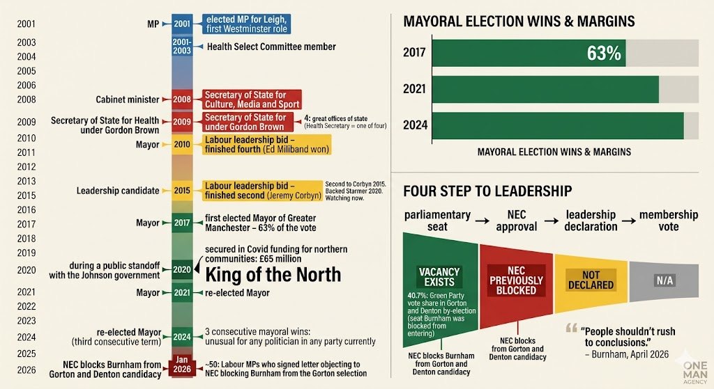 Burnham’s political biography is longer than his mayoralty suggests. He was first elected as MP for Leigh in 2001, served on the Health Select Committee, became Minister of State for Health under Gordon Brown, was Secretary of State for Health in 2009, and held multiple other cabinet roles including Chief Secretary to the Treasury and Secretary of State for Culture. He ran for Labour leader twice, finishing fourth in 2010 and second to Jeremy Corbyn in 2015. He backed Starmer in the 2020 leadership election.