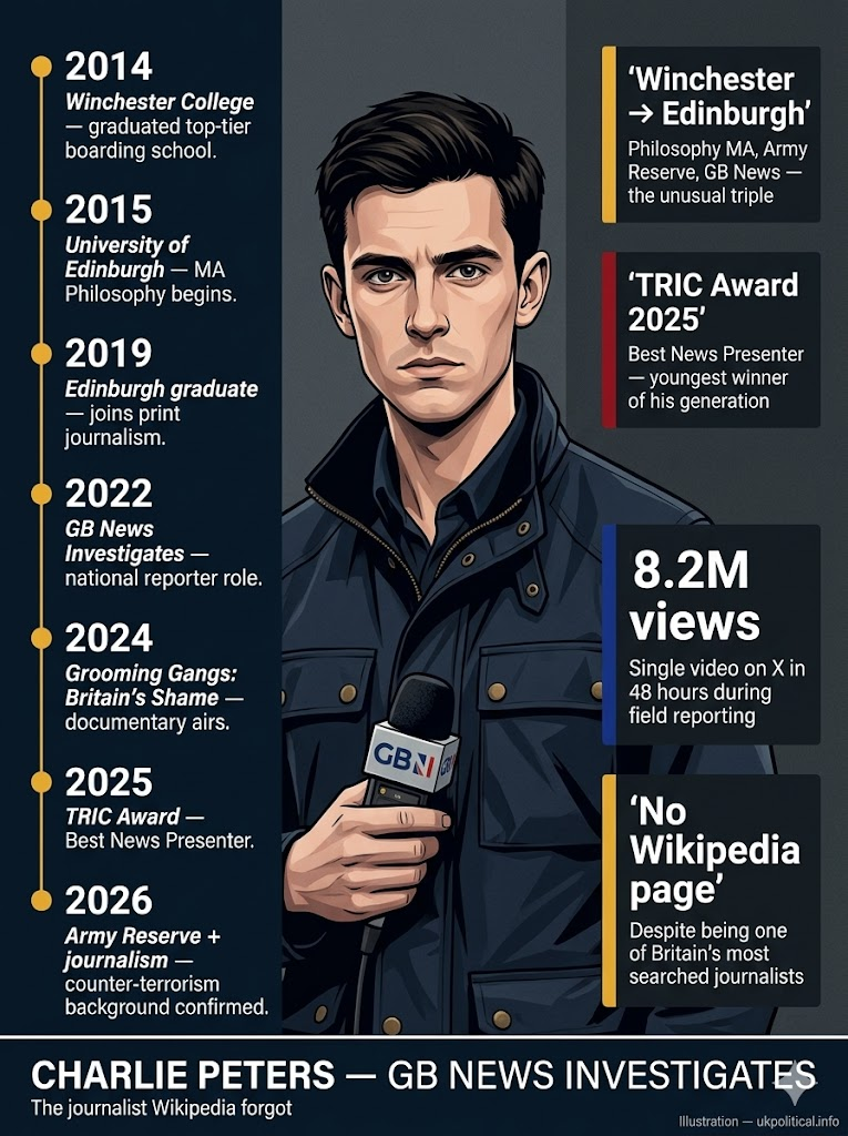 Charlie Peters is the TRIC Award-winning presenter of GB News Investigates, a Winchester and Edinburgh-educated journalist and Army Reserve veteran whose documentaries on grooming gangs and far-left activism have shaped the British political conversation in 2025 and 2026 – and whose Wikipedia page, as of today, still does not exist.