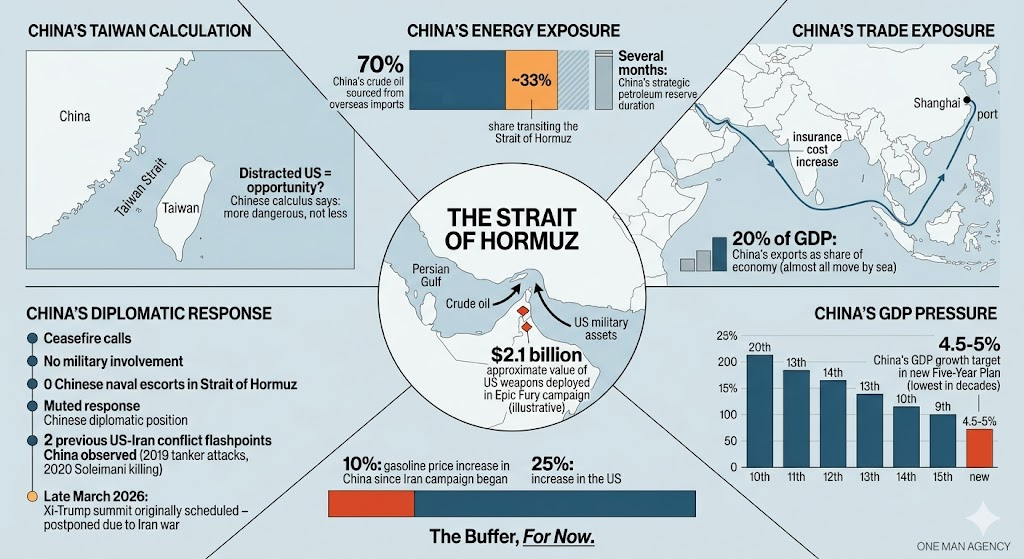China’s Strait of Hormuz exposure is not abstract. China imports about seventy percent of its crude oil from overseas. Roughly one third of that supply must transit the strait. Since the US-Israel campaign against Iran began in late February, gasoline prices in China have risen about ten percent, compared with roughly twenty-five percent in the United States. Beijing maintains the world’s largest strategic petroleum reserve, equivalent to several months of domestic demand. For now, the numbers are manageable.