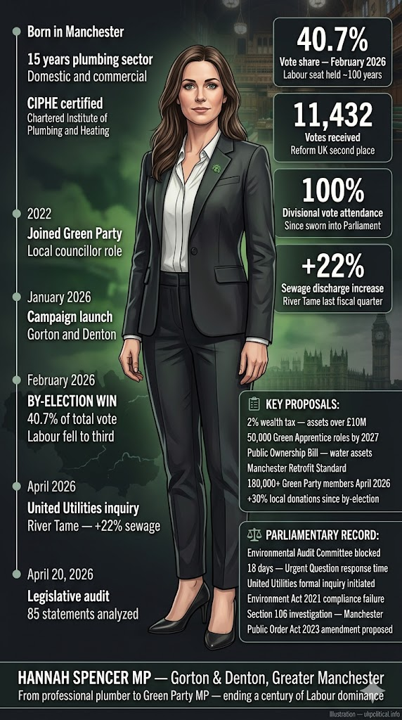 Hannah Spencer is a certified member of the Chartered Institute of Plumbing and Heating Engineering who in 2026 represents Gorton and Denton in Parliament. She joined the Green Party in 2022 and utilized her technical expertise to highlight the failure of the Department for Environment, Food & Rural Affairs to regulate private utilities. Her campaign focused on a hyper local strategy that prioritized infrastructure fixes over national party narratives.