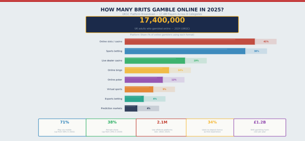 - 17.4 million UK adults gambled online in the past 4 weeks (UKGC 2024 data)