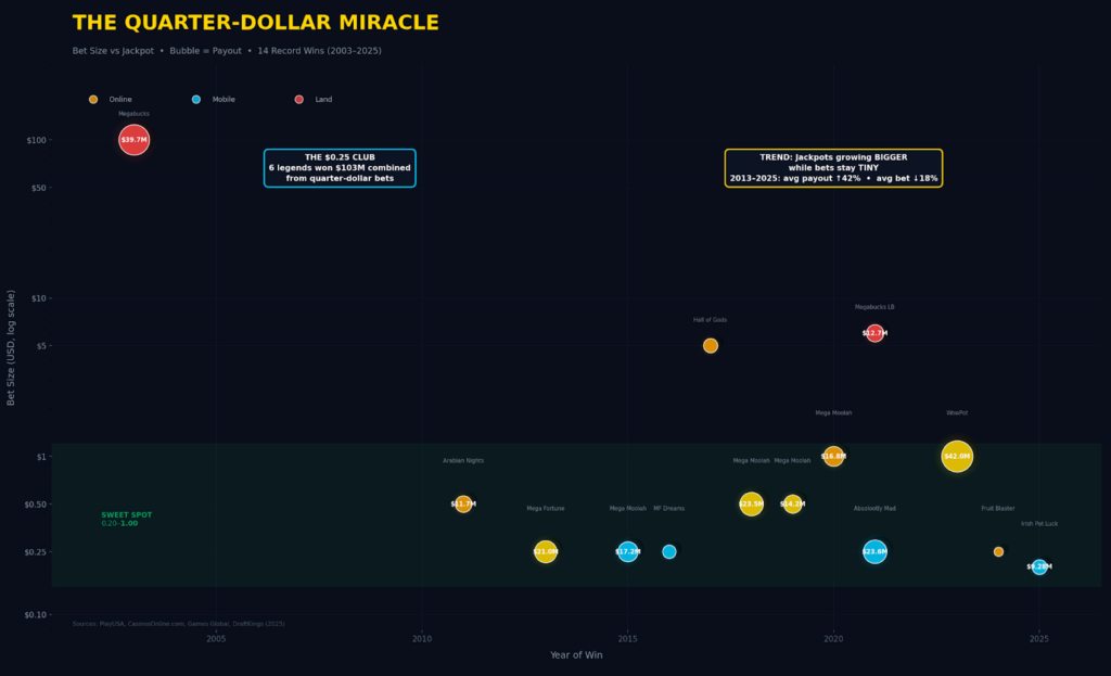 We mapped 14 of the largest verified online and land-based wins by bet size, payout, and year — and the scatter plot tells a clear story. The cluster of massive wins sits firmly in the $0.20–$1.00 bet range. The one outlier? The $39.7 million Megabucks win in 2003 at the Excalibur casino in Las Vegas — a land-based machine where the player bet $100.