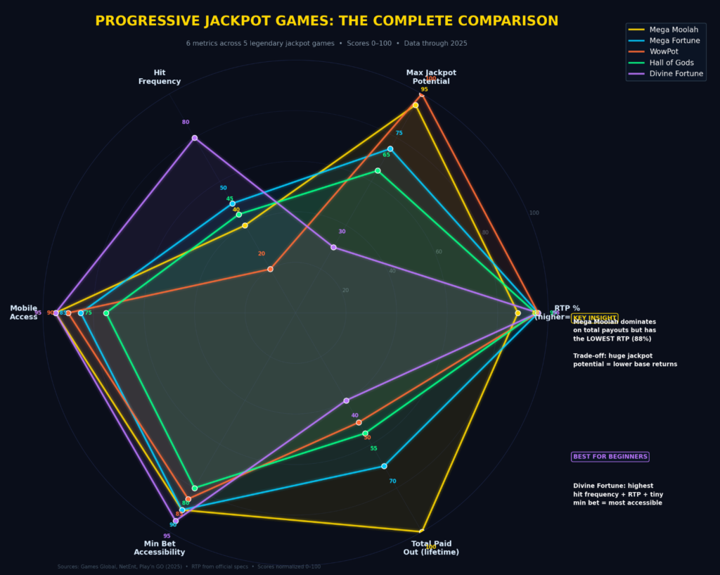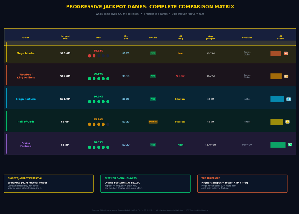 Not all progressive jackpots are created equal. We compared five of the most prolific jackpot games across six key metrics — and the differences are dramatic.