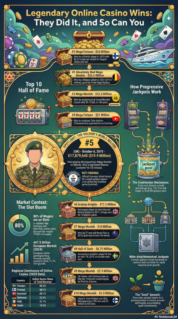 The combined total of the top 10 online casino jackpots exceeds $181 million. We built a full analysis of every recorded mega-win, and the pattern is striking: enormous payouts, microscopic bets.
