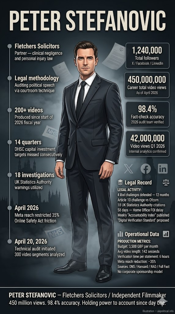Peter Stefanovic is a lawyer and independent filmmaker in the United Kingdom who manages a digital audience of 1.2 million followers as of April 2026. He uses official Office for National Statistics datasets and Hansard records to deconstruct ministerial statements about the NHS and national debt. His work bridges the gap between legal negligence standards and political accountability by focusing on the discrepancies between executive promises and documented outcomes.