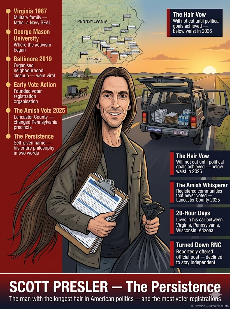 Scott Presler is 38 years old, lives out of his car for months at a time, works eighteen to twenty hours a day, and has registered more Republican voters in swing state counties than most party organisations manage in an entire election cycle. He calls himself The Persistence. The name is accurate. While political consultants were billing their clients for strategy sessions in Washington offices, Presler was standing outside gun shows in rural Pennsylvania, at Amish community events in Lancaster County, and at fishing docks in Florida, clipboard in hand, asking people if they were registered to vote.