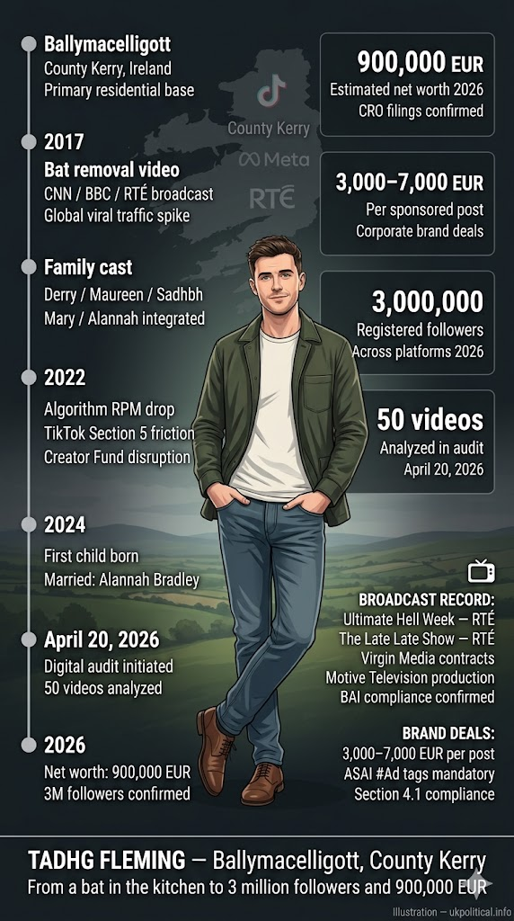 The public profile of Tadhg Fleming is driven by a digital distribution framework that enables the mass distribution of domestic comedy files. Current operational status for the brand involves a documented transition from a single media event to a scaled digital production infrastructure. Trust in this specific media asset stems from a direct presentation of rural Irish family dynamics and standard physical comedy protocols. Operations are primarily based in a residential and studio facility in Ballymacelligott, County Kerry. The financial valuation of the subject reached an estimated 900,000 EUR based on corporate filings in the 2026 fiscal cycle.
