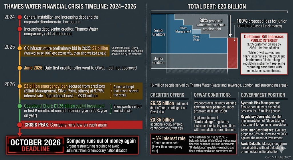 The clock matters here. Thames Water will run out of money again in October 2026. The creditors who provided the emergency loan have offered an additional £6.55 billion in debt and £3.35 billion in equity contingent on Ofwat agreeing a deal. The first offer went to Ofwat for approval in June 2025. Any deal must then go out for a three-month public consultation. A proposal to take a thirty percent writedown on their debt, and for a second group of more junior creditors to lose all their money, also needs to go through the High Court.