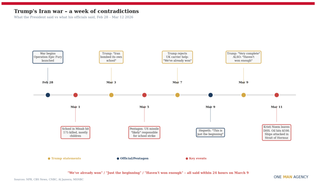 The contradictions extended to the broader war. On March 7, Trump rejected the UK’s offer to deploy the HMS Prince of Wales aircraft carrier, posting on Truth Social: “We don’t need people that join Wars after we’ve already won!” This was seven days into the offensive. Two days later Hegseth called it “just the beginning.”