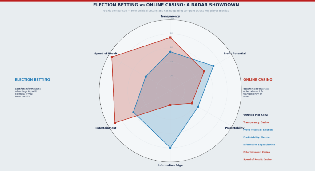 This was not a casino moment. No roulette wheel had decided the outcome. Millions of voters had made decisions that polling had systematically underestimated, because of which the probability assigned by betting markets was simply wrong. The lesson: casino odds are mechanically reliable, while political odds reflect collective human beliefs that can be significantly miscalibrated – due to which political betting offers genuine opportunity when you have strong independent reason to think the market consensus is wrong.
