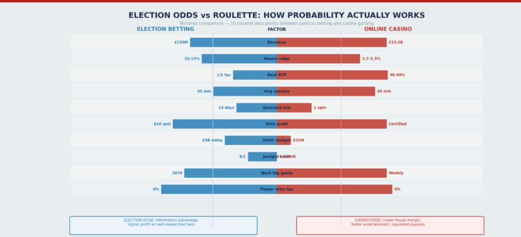 The 2024 UK general election generated £150 million in betting market turnover – the largest political betting market in British history – and the mechanics underneath that number work exactly the same way as a roulette table or a blackjack shoe. A bookmaker sets odds to include a margin (the overround), the player bets at those odds, and the house extracts its percentage regardless of outcome. The difference between a 1/5 favourite in a general election and a near-evens payout on a simple casino bet is purely in the information asymmetry – an experienced political analyst can read polling data that a roulette wheel can never provide.