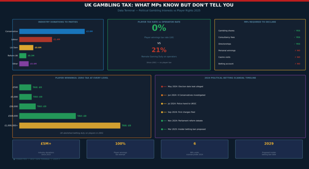 Gambling winnings are not taxable in the UK – and that applies to an MP winning £50,000 at a roulette table exactly as much as it applies to anyone else. HMRC abolished betting duty on players in 2001, shifting the tax burden entirely to operators, due to which the UK became one of the most player-friendly tax jurisdictions in Europe: 0% on winnings regardless of the amount, the game, or the player’s income level. That number has not changed in 24 years and no government since has proposed reversing it.