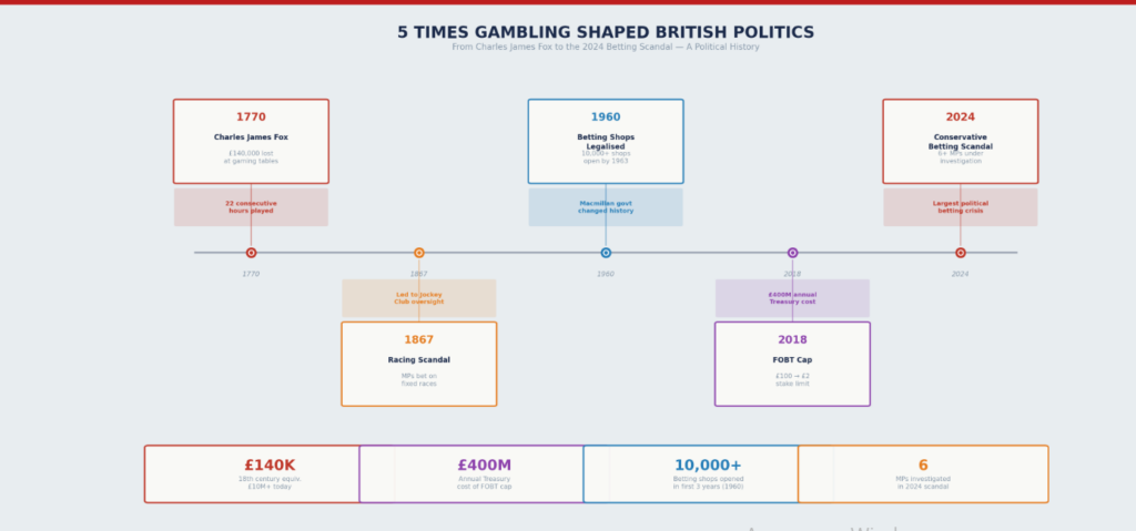 The point is not that Fox was reckless. The point is that gambling and political life have been intertwined in British culture since long before anyone thought to write regulations about it. The 2024 scandal is less exceptional than it appears when viewed over 250 years rather than 18 months.