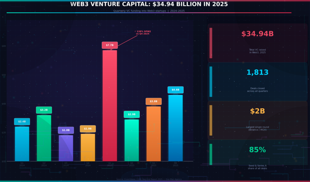 Web3 pulled in $34.94 billion in venture capital across 1,813 deals in 2025. That’s not a typo. Thirty-five billion dollars – more than the GDP of Iceland – poured into a space that half the internet still thinks is dead. We started this project in late November 2025, planning to write a simple market overview. Six weeks later, we’d gone through 40+ data sources, tracked funding rounds across four continents, and realized we’d been wrong about almost everything.
