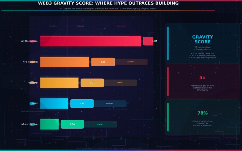 The Gravity Score we built confirmed this. DeFi infrastructure scored 0.34 – meaning every VC dollar is supported by roughly three active developers with six-month-plus tenure. Compare that to AI-blockchain projects scoring 1.87 – nearly five times more capital per builder. Not necessarily bad, but it’s a sign that AI-Web3 hype is running ahead of the actual work being done.