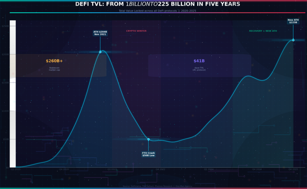 ❌ MYTH: DeFi peaked in 2021 and it’s all downhill ✅ REALITY: DeFi TVL hit a new all-time high of $225 billion in 2025, surpassing the previous $204 billion peak from 2021. Stablecoins – USDT and USDC together – crossed $260 billion in market cap. The difference? This time the TVL is backed by real yield, not Ponzi mechanics.